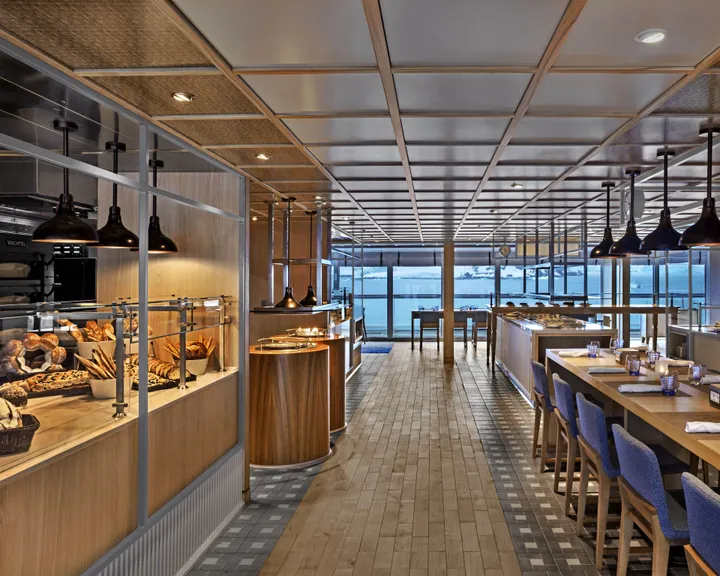 The World Cafe where most passengers enjoy breakfast and lunch is double the size of the R class facilities. There is always a table available and bundles of room. No having to shift you chair a bit to let someone through. No casino or kids either - this ship is for older adults looking for a completely relaxing upmarket holiday. I noticed on boarding how quiet and orderly everything is on this ship. Furnishings are so clean and new walking about reminds me of a joining a new hotel inspection. Finally the staff - extremely well trained, always polite.